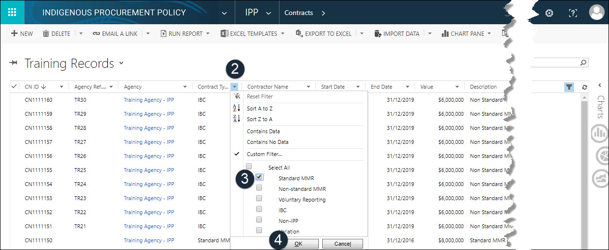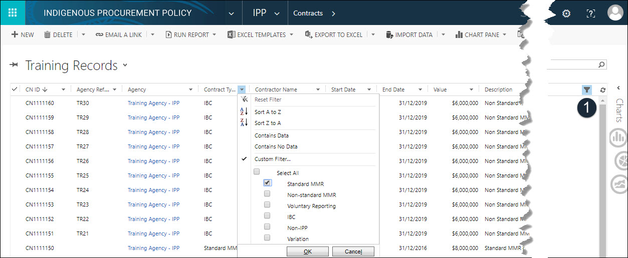 - Custom Filter checkbox: select the options within the custom filter. In the above example, the Standard MMR checkbox has been selected to filter only those contract type records containing Standard MMR.